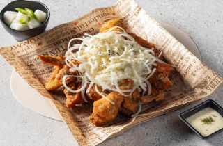 바삭한 순살에 채썰은 양파와 크리미어니언 소스를 곁들여 먹는 아주맛난 치킨