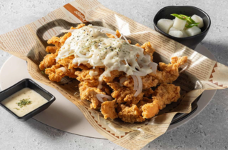 달래고 크리미어니언 소스와 채썬 양파와 취향에 맞게 바삭순살,후라이드,바삭크리스피치킨 선택